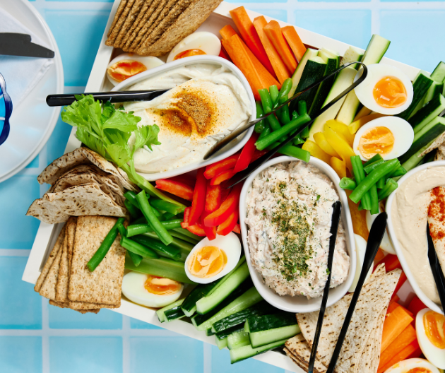 A colourful, share-style platter with fresh vegetables, dips, and crackers – ideal for entertaining while staying kidney-friendly.