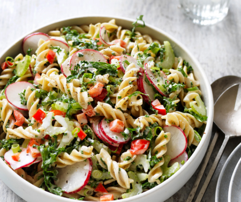 This colourful pasta salad features al dente spiral pasta mixed with fresh veggies like capsicum, celery, radish, green onion, and kale.